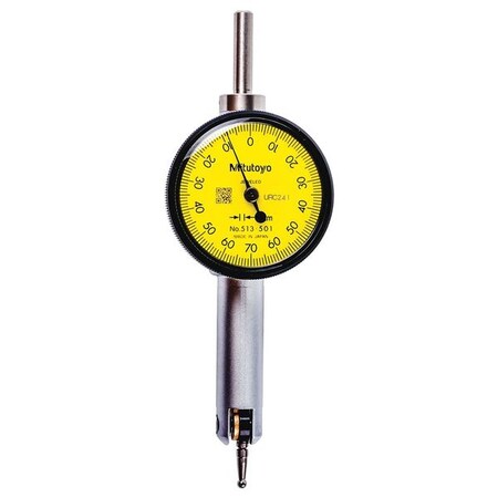 Mitutoyo 513-501T Pocket Type Dial Test Indicator, Full Set, Horizontal Type, 4mm Stem Dia., Yellow Dial, 0-70-0 Reading, 33mm Dial Dia., 0-0.14mm Range, 0.001mm Graduation, +/-0.003mm Accuracy