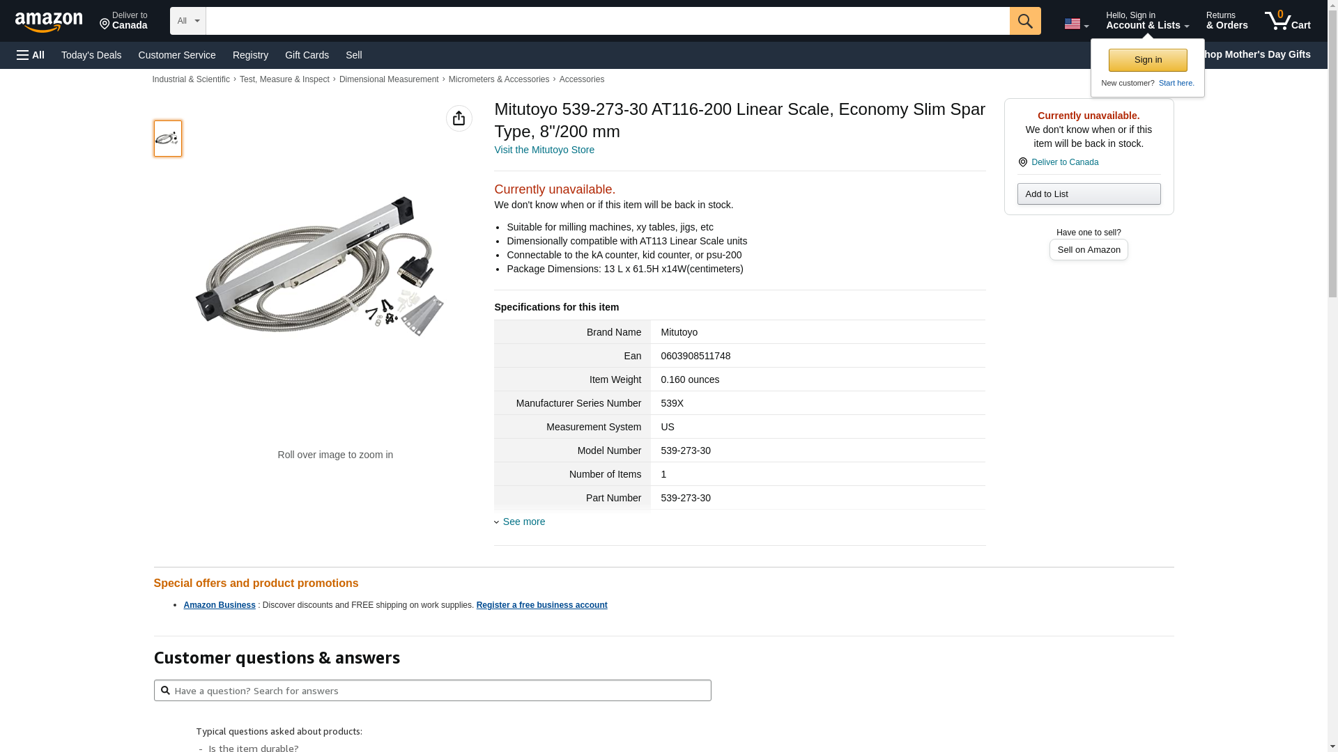 Mitutoyo 539-273-30 AT116-200 Linear Scale, Economy Slim Spar Type, 8"/200 mm