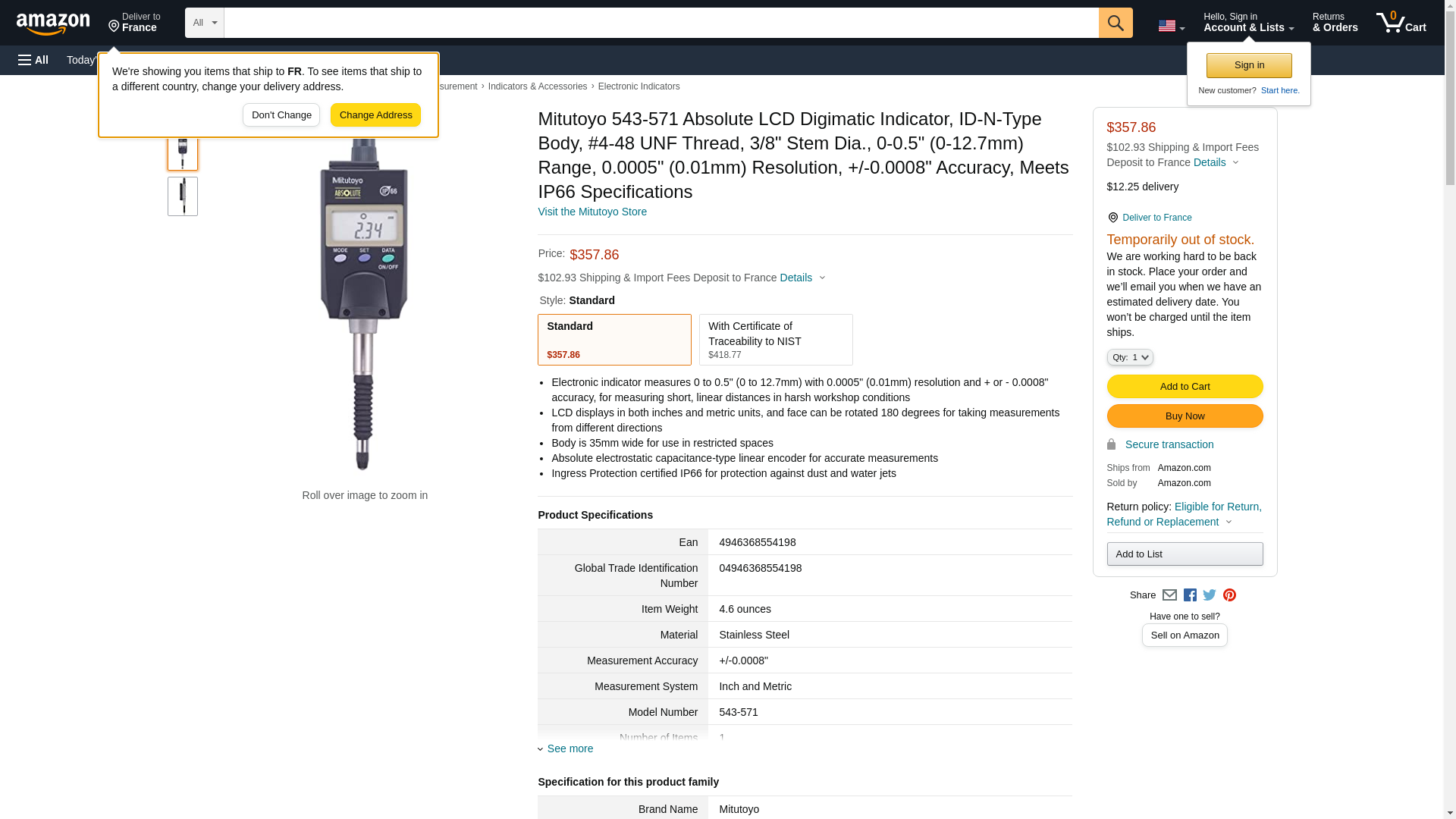Digital Indicator, Series Series 543, Resolution 0.0008 in, 0.02 in, Accuracy +/-0.0008 in, Range 0 in to 0.5 in, Long Form Calibration Certificate No