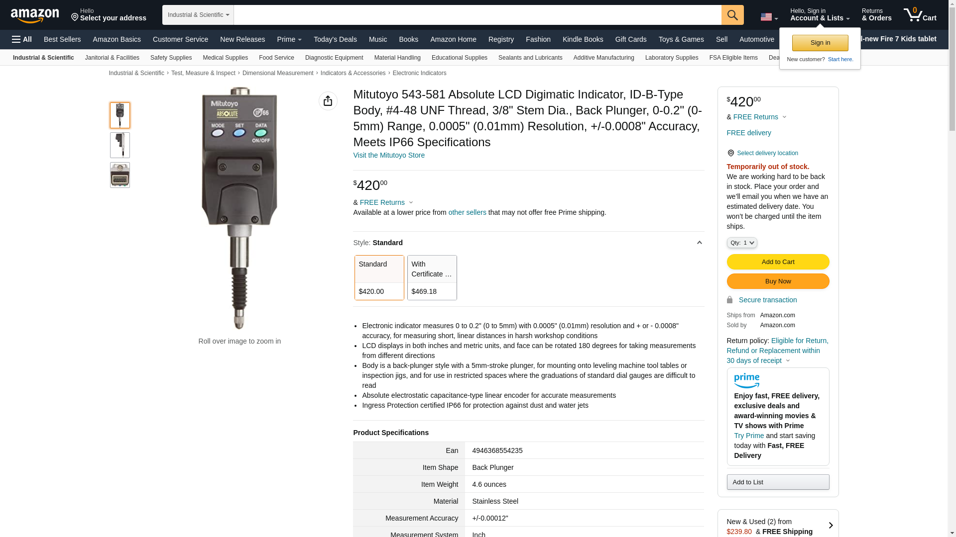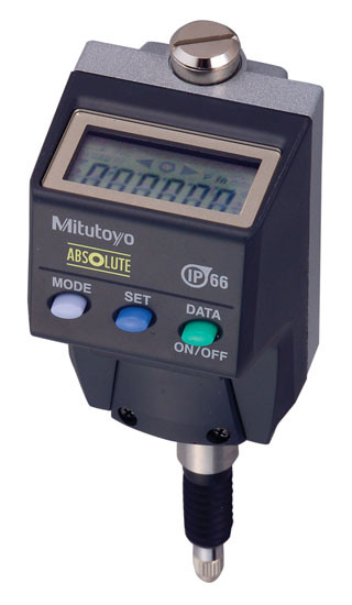 Mitutoyo 543-581 Absolute LCD Digimatic Indicator, ID-B-Type Body, #4-48 UNF Thread, 3/8" Stem Dia., Back Plunger, 0-0.2" (0-5mm) Range, 0.0005" (0.01mm) Resolution, +/-0.0008" Accuracy, Meets IP66 Specifications