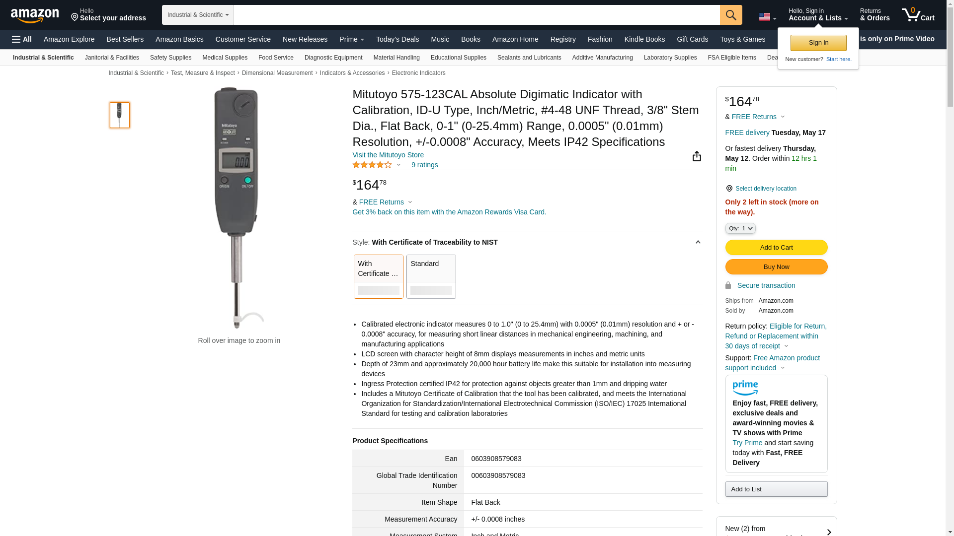 Mitutoyo 575-123CAL Absolute Digimatic Indicator with Calibration, ID-U Type, Inch/Metric, #4-48 UNF Thread, 3/8" Ste...