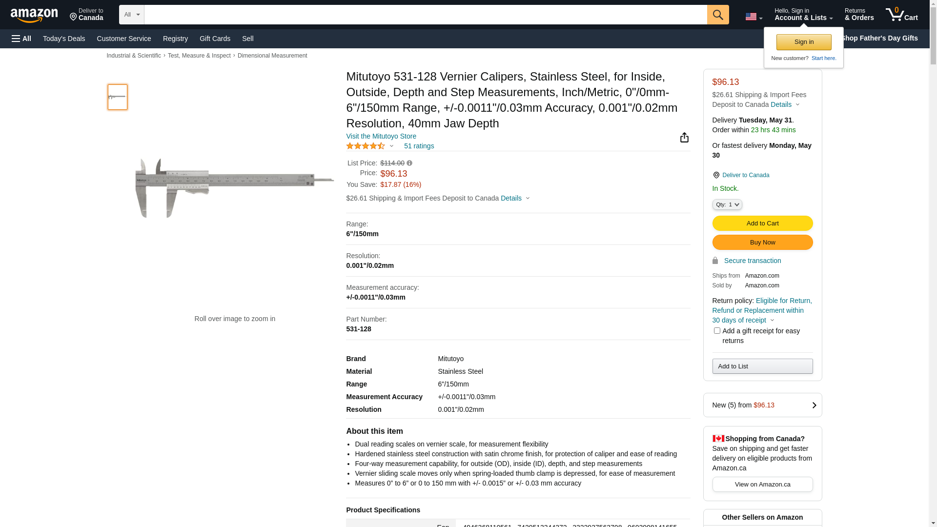 | Feature | Price For: Each Includes: Plastic Holster Measures: Outside, Inside, Depth and Step Range (mm): 0 to 150 Finish: Satin Chrome Accuracy Rating: +/-0.03mm Range (In.): 0 to 6 Material: Hardened Stainless Steel Item: Vernier Caliper Graduations (mm): 0.02 Graduations (In.): 0.001 Jaw Depth (In.): 1.57 Country of Origin (subject to change): Japan |