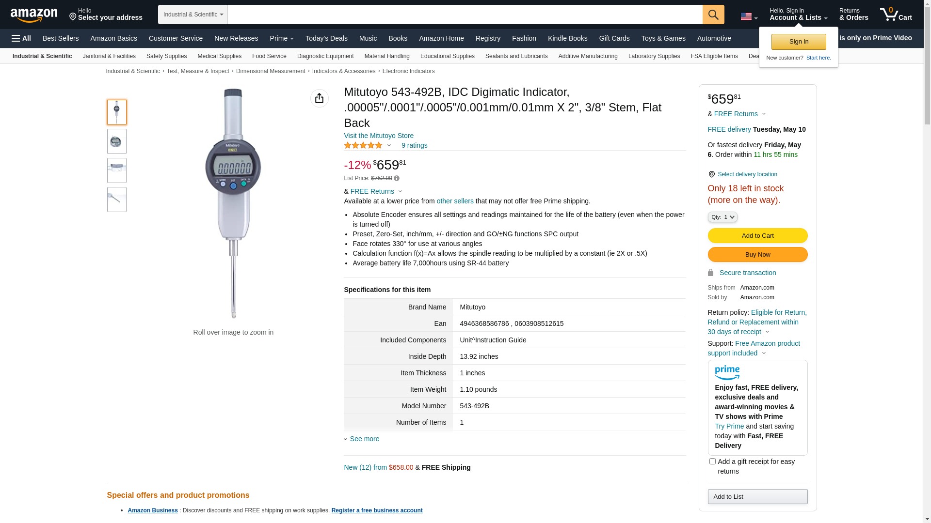 Mitutoyo 543-492B, IDC Digimatic Indicator, .00005"/.0001"/.0005"/0.001mm/0.01mm X 2", 3/8" Stem, Flat Back