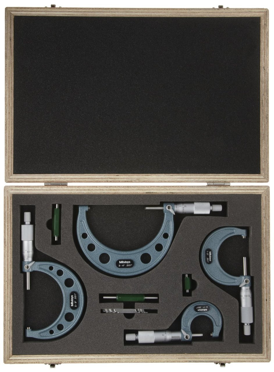 - Set includes four ratchet stop micrometers in 1" increments, three standards in 1" increments, an adjustment wrench, and a fitted box