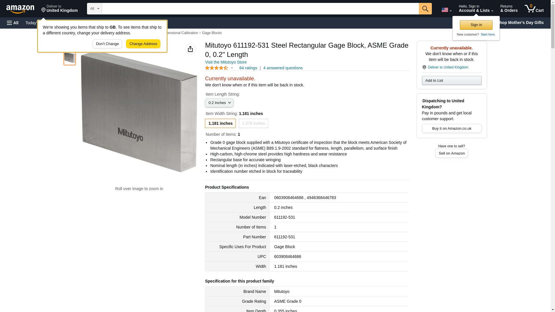Mitutoyo 611192-531 Steel Rectangular Gage Block, ASME Grade 0, 0.2" Length