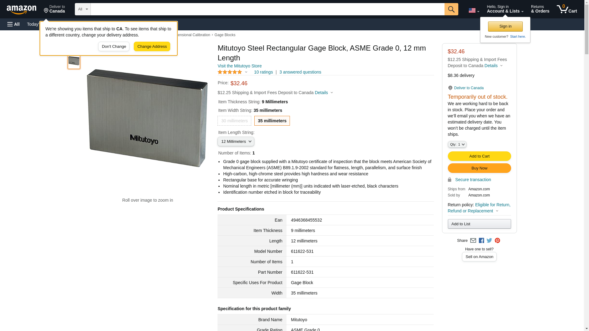 Mitutoyo Steel Rectangular Gage Block, ASME Grade 0, 12 mm Length