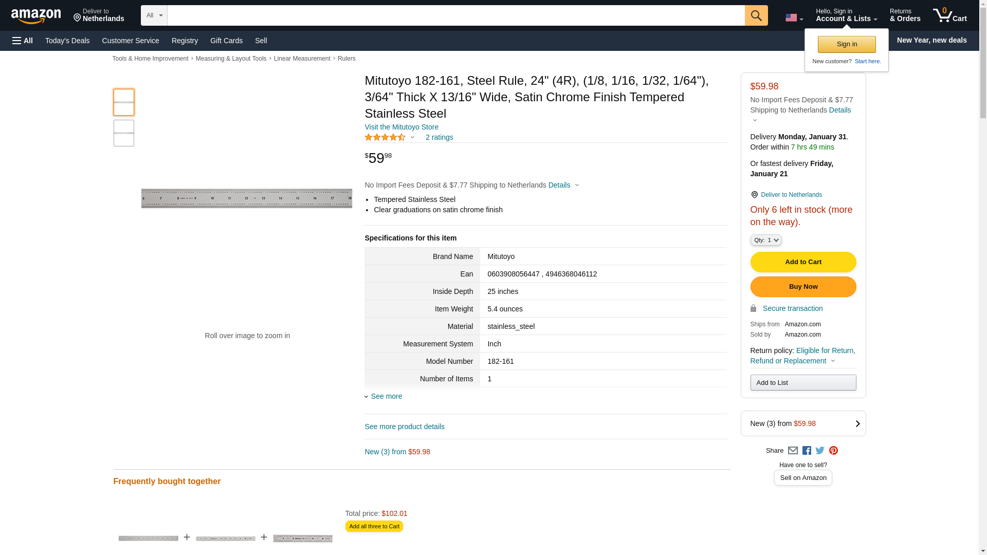 Mitutoyo 182-161, Steel Rule, 24" (4R), (1/8, 1/16, 1/32, 1/64"), 3/64" Thick X 13/16" Wide, Satin Chrome Finish Tempered Stainless Steel