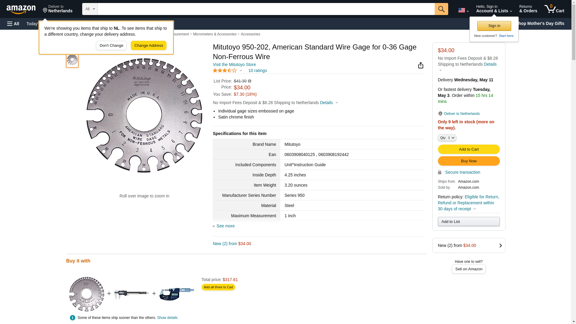 Mitutoyo 950-202, American Standard Wire Gage for 0-36 Gage Non-Ferrous Wire