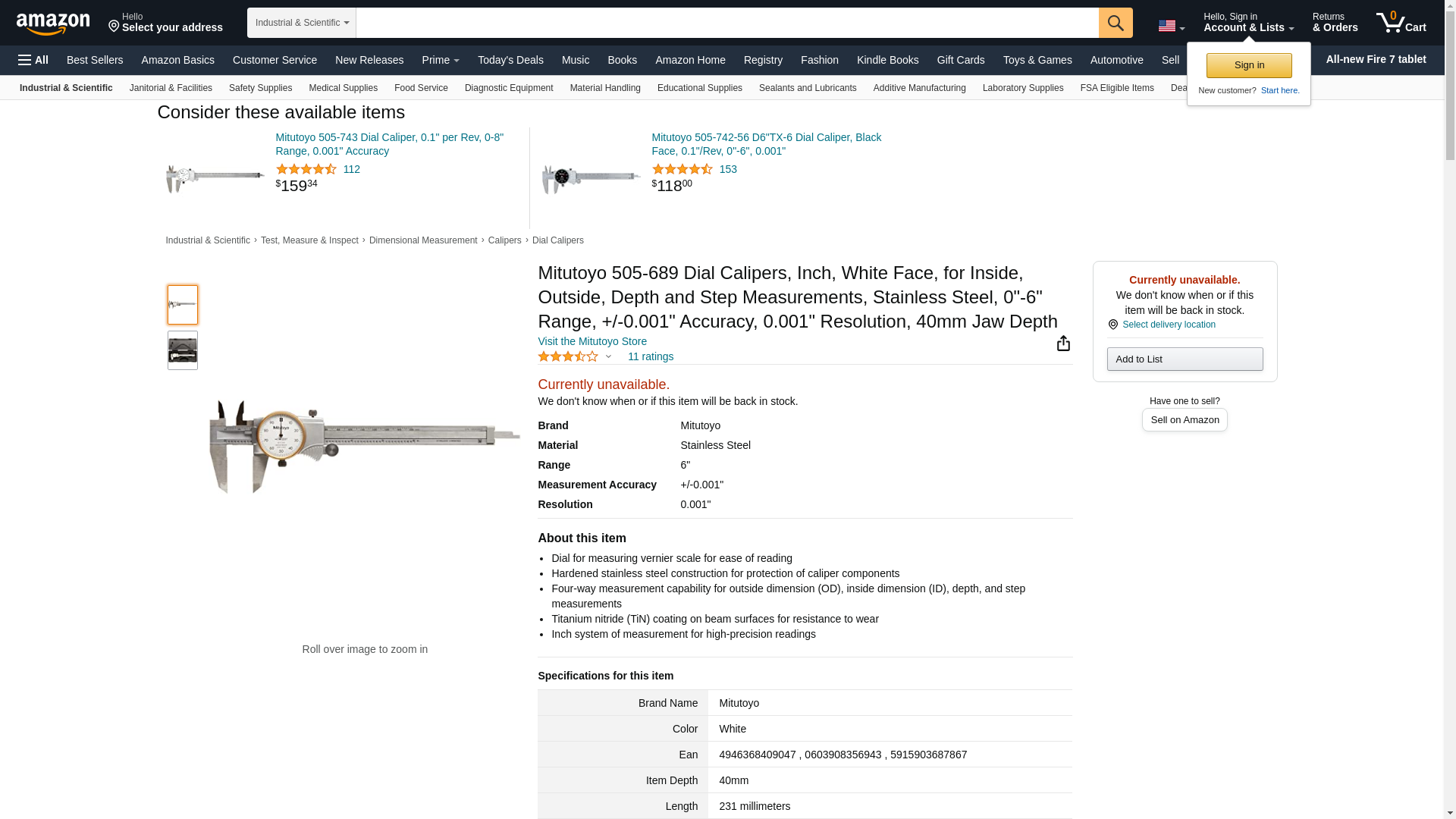 Mitutoyo 505-689 Dial Calipers, Inch, White Face, for Inside, Outside, Depth and Step Measurements, Stainless Steel, 0"-6" Range, +/-0.001" Accuracy, 0.001" Resolution, 40mm Jaw Depth