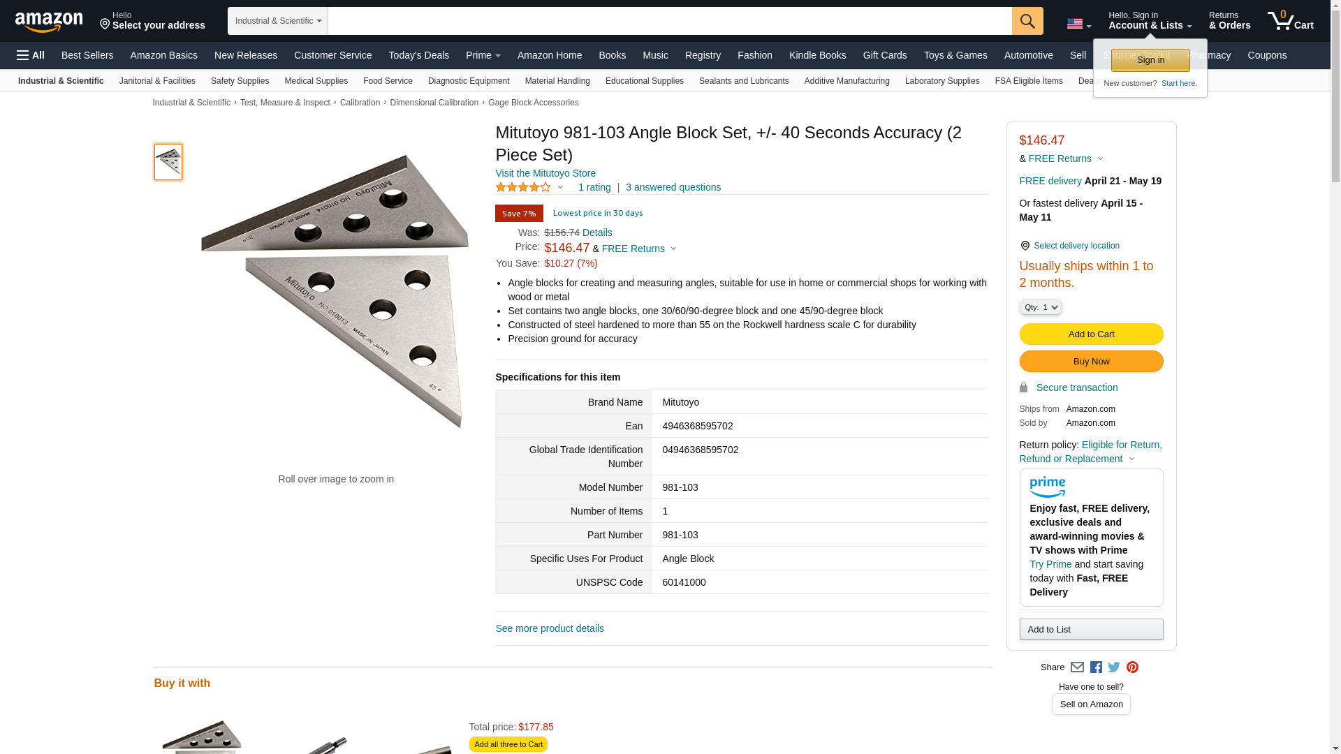 Mitutoyo 981-103 Angle Block Set, +/- 40 Seconds Accuracy (2 Piece Set)