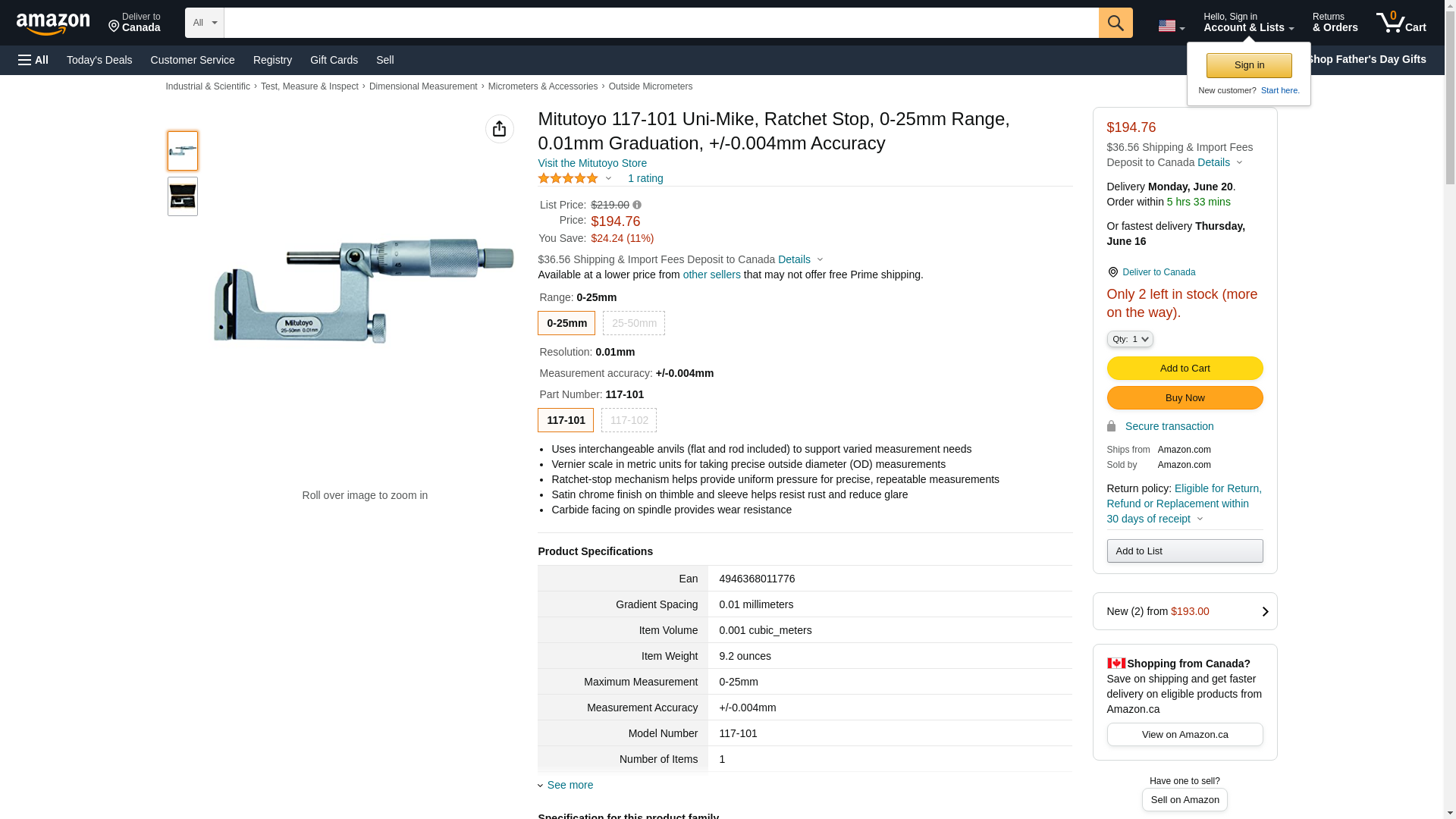 Mitutoyo 117-101 Uni-Mike, Ratchet Stop, 0-25mm Range, 0.01mm Graduation, +/-0.004mm Accuracy