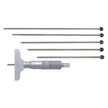 Mitutoyo 129-112 Vernier Depth Gauge, Interchangeable Rods, Micrometer Type, 0-150mm Range, 0.001mm Graduation, +/-0.0040mm Accuracy, 63.5mm x 16mm Base, 6 Rods