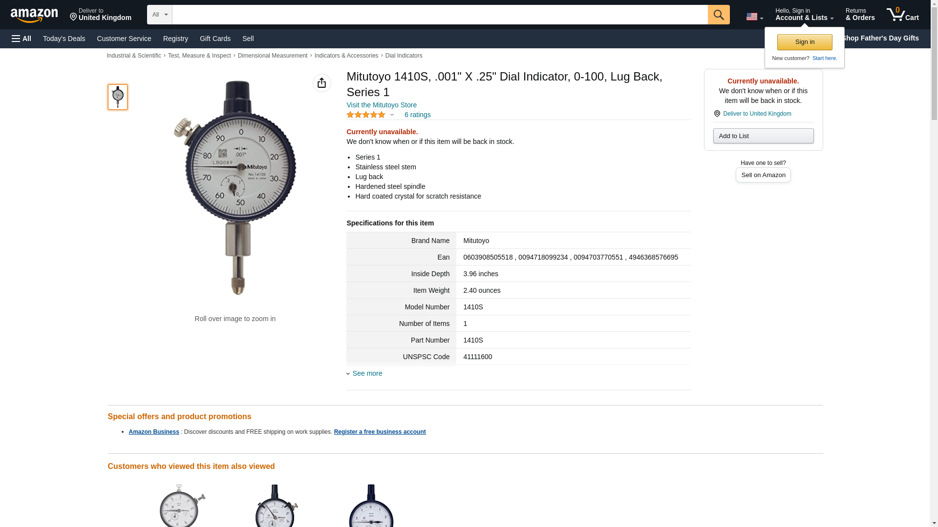 Mitutoyo 1410S, .001" X .25" Dial Indicator, 0-100, Lug Back, Series 1