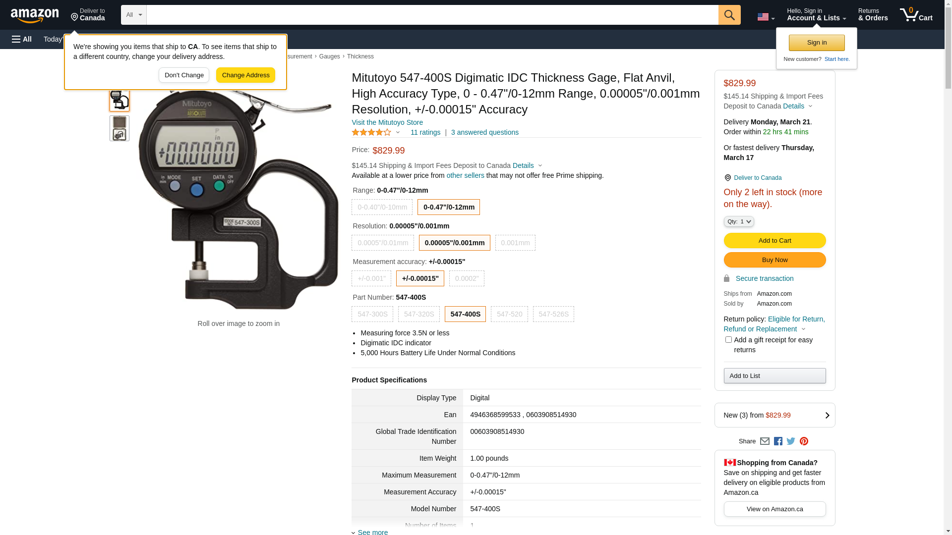 Mitutoyo 547-400S Digimatic IDC Thickness Gage, Flat Anvil, High Accuracy Type, 0 - 0.47"/0-12mm Range, 0.00005"/0.001mm Resolution, +/-0.00015" Accuracy