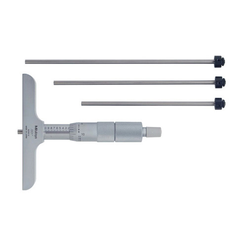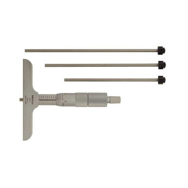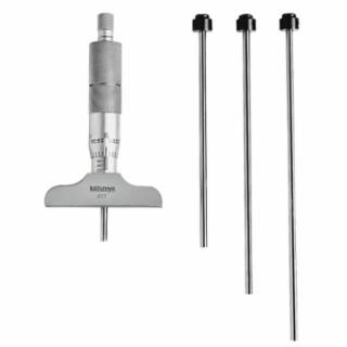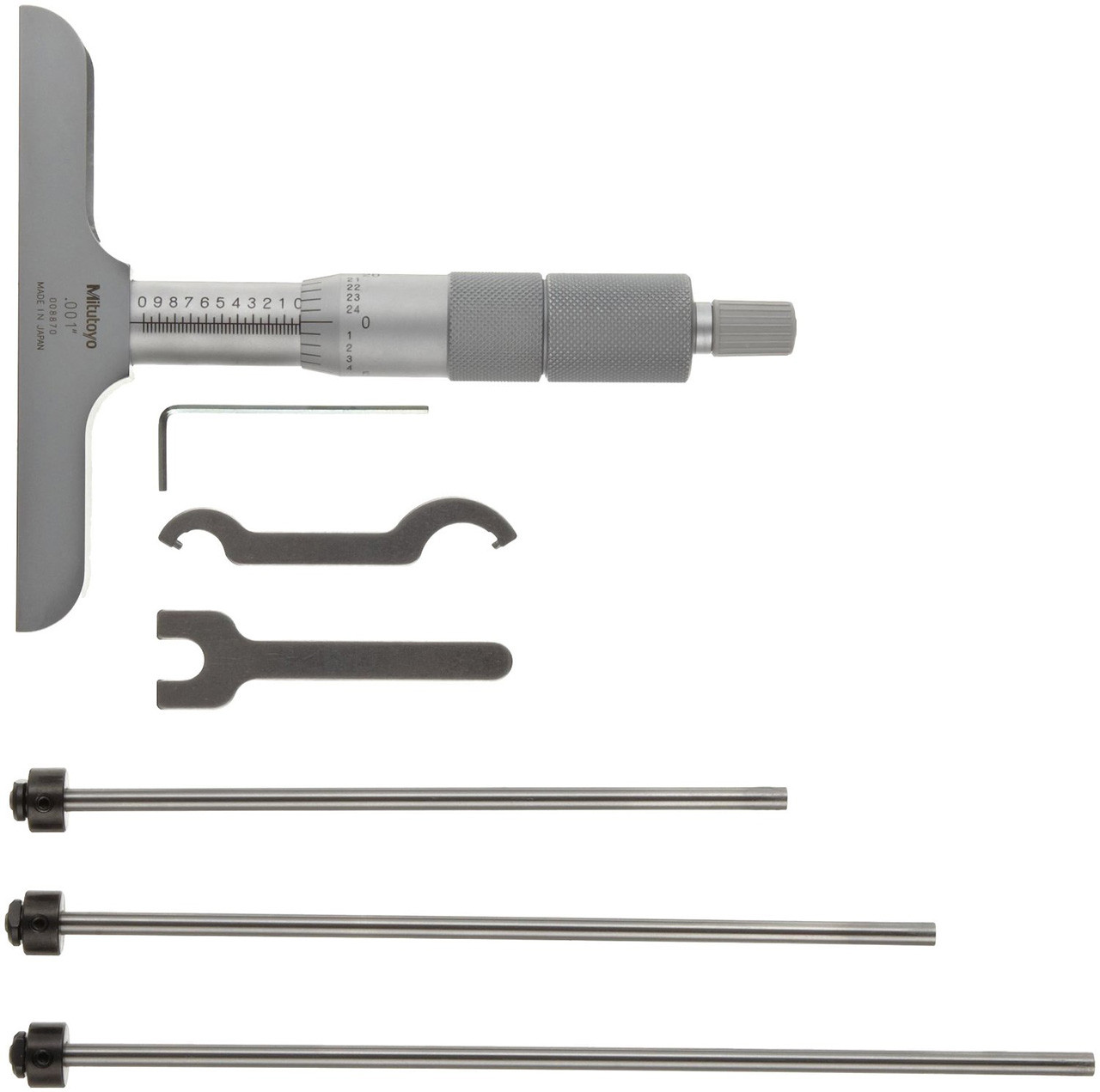 Mechanical Depth Micrometer, Range 0 in to 4 in, Resolution 0.001 in, Accuracy +/-0.00015 in, +/-0.003 mm, Long Form Calibration Certificate No, Base Length 4 in, Base Style Full, Dimension Type Inch, Mechanical Display Type None, Number of Measuring Rods 4, Operation Type Mechanical, Rod Diameter 4 mm, Anvil Material Steel, Anvil Shape Flat, Case Included Yes, Case Type Plastic