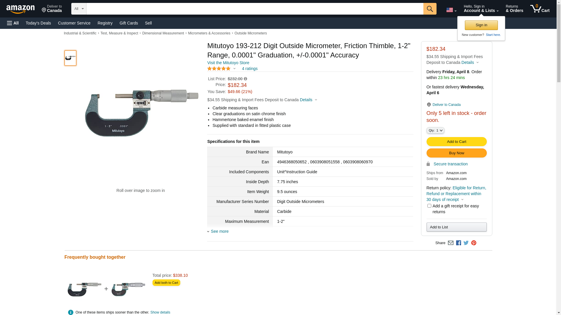 Mitutoyo 193-212 Digit Outside Micrometer, Friction Thimble, 1-2" Range, 0.0001" Graduation, +/-0.0001" Accuracy