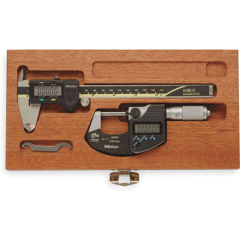 Precision Measuring Tool Kit, Number of Pieces 3, Micrometer Range (In./mm) 0 to 1 in /0 to 25mm, Micrometer Resolution (In./mm) 0.00005 in /0.001mm, Friction Thimble, Caliper Range (In./mm) 0 to 6/0 to 150, Caliper Resolution (In./mm) 0.0005 in /0.01mm, Range per Revolution (In.) -, Includes (1) Micrometer, (1) Digimatic Caliper, (1) Case