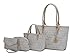 Alexy M Signature Bag Set, White Features. Fabric lining. Designed with luxurious gold tone embellishments. Zipper top closure. Matching mini tote. Matching pouch. Matching wristlet. Metal feet on the bottom to keep bag upright position. 4 PiecePockets. Interior of Alexy Tote features a spacious compartment, with a wall zipper pocket and two slipin pockets perfect for IDs, Phone, or Money. Exterior features back zipper pocket.Specifications. Color White. Tote Handles 11 in.. Wristlet 8 in.. Mini tote Handles 4.7 in.. Fabric Lining. Material Made of highquality vegan leather. Tote measurements 17.5 in. L x 10.3 in. H x 5 in. D. Mini tote measurements 11.5 in. L x 7 in. H x 4.2 in. D. Pouch measurements 9.1 in. L x 5.5 in. H x 3 in. D. Wristlet Coin wallet measurements 5.5 H x 7.5 L in.. Weight 2 lbs