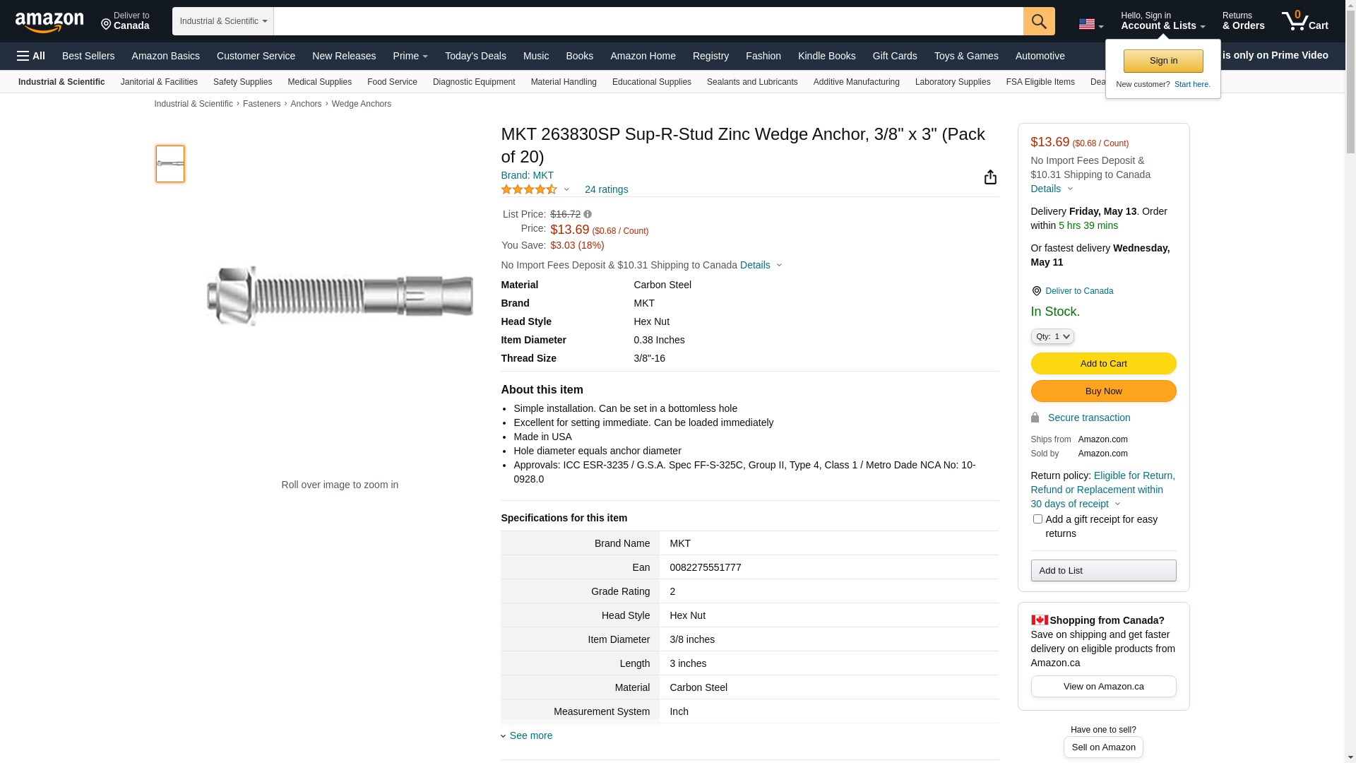 MKT 263830SP Sup-R-Stud Zinc Wedge Anchor, 3/8" x 3" (Pack of 20)