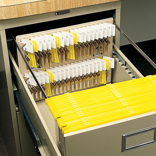 Molded plastic file drawer key rack features adjustable clamps that attach to the back of standard office file drawers, deep desk drawers or partitions. Ideal for out-of-the-way key control. Comes complete with 40 numbered key tags, out-key control tags and key control chart.