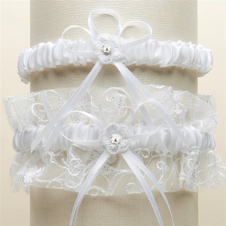 This vintage Wedding Garter Set has whimsical embroidered floral swirls accented with dainty applique flowers. Our beautifully boxed 2 piece set is reminiscent of 1920's bridal glamour and includes a 2 1/4in. keepsake garter along with a 1/2in. h tossing garter. These ruffled garter sets have a satin center band and are available in all white. Ground shipping is available for this item (Expedited shipping is not available). **Sorry, we are unable to ship this product to HI, AK, AE, Guam, Canada or Puerto Rico**