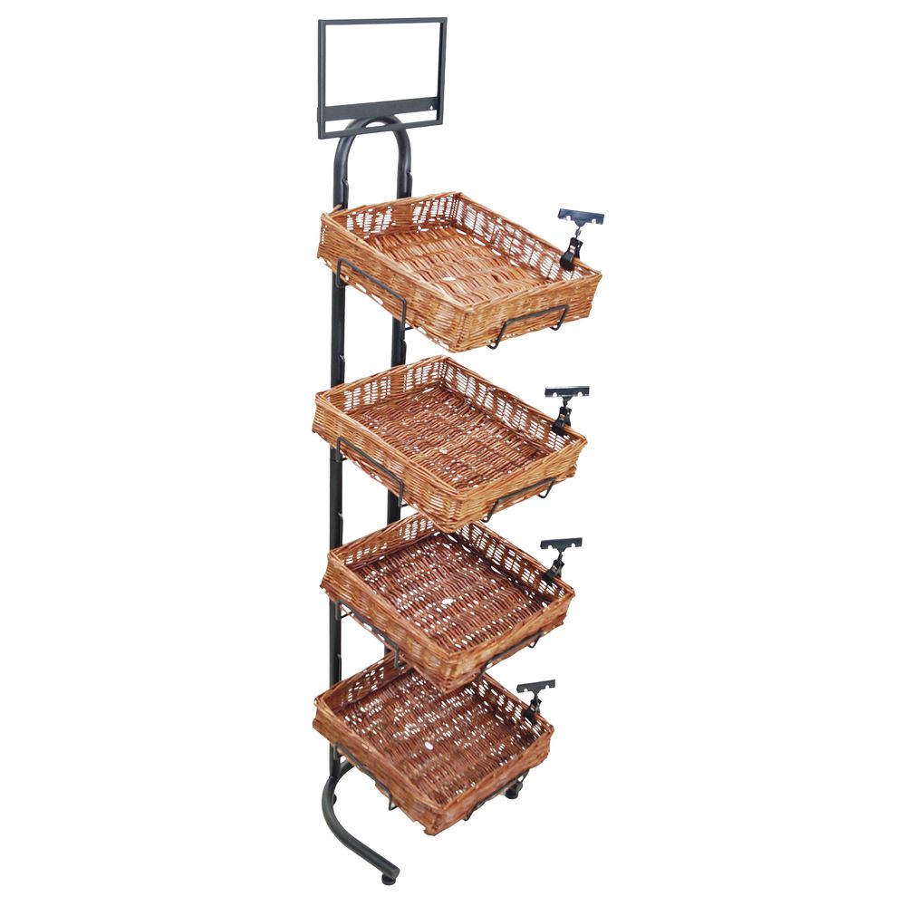 This 4-tier willow basket floor display from Mobile Merchandisers comes complete with 4 square willow baskets 4 sign clips and 1 mountable sign frame. Great for chips crackers snacks bakery items and more!<br>Model #: K1430/4B14Matte black frame4 square willow basketsIncludes 4 sign clips and 1 mountable sign frameBasket dimension: 15"W x 15"D x 4"HTop sign dimension: 11"W x 7"H