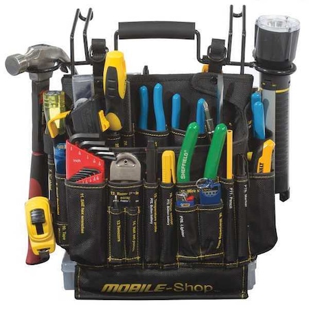 'Take every principle we used when we developed the Mobile-Shop System, condense it into the ultimate grab-and-go tool bag and you have the Mobile-Shop Tool Bag, which is available on every Mobile-Shop cart and for individual purchase as well. The Mobile-Shop Tool Bag is labeled for effortless organization and designed to hold over 90 of the most commonly needed tools and parts. It?ÇÖs ideal for light maintenance, maintenance in confined spaces, and portable maintenance applications just about everywhere. Master Tool Set, Tool Families Included Awls and Scribers, Brushes, Cutting Tools, Deburring and Finishing Tools, Drilling, Extracting, and Tapping Tools, Electrical and Telecomm Tools, Hex and Torx Keys, Inspection and Retrieving Tools, Lights, Measuring Tools, Pliers, Prybars and Pullers, Putty Knives and Scrapers, Screwdrivers, Sockets and Accessories, Striking Tools, Wrenches, Tool Kit Product Grouping Tool Kits, Primary Application General Purpose, Yes, Tool Storage Type Included Bag, SAE'