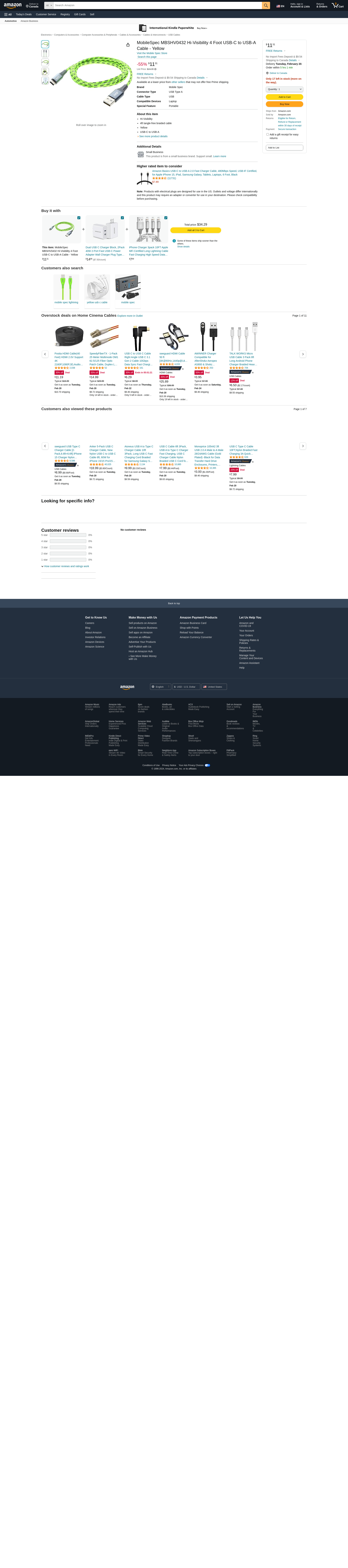 MobileSpec MBSHV0432 Hi-Visibility 4 Foot USB-C to USB-A Cable - Yellow