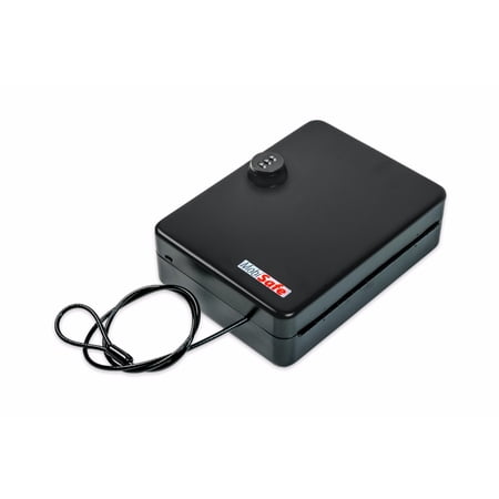 Portable gun safe is made out of 16 gauge steel with a matte black finish, Aircraft cable is made of woven steel with a black vinyl coating ? it has a 0.2? diameter, Interior is lined with foam to keep items from sliding around and getting scratched.