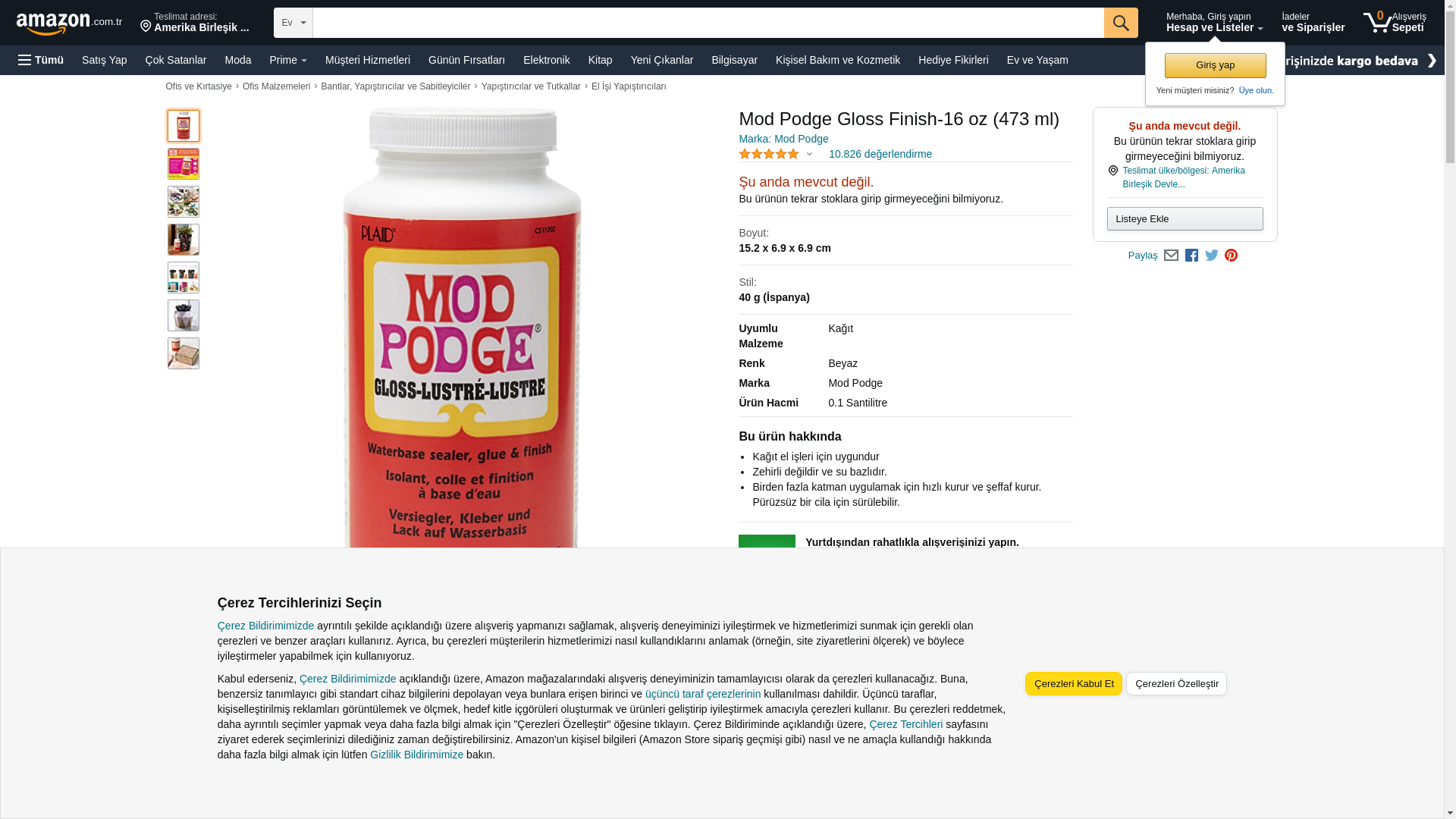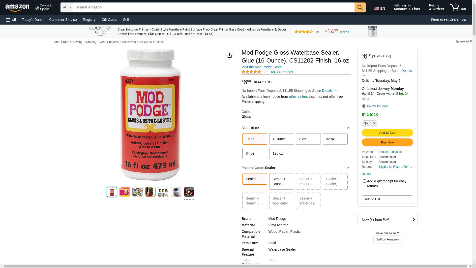 Mod Podge Gloss is an all-in-one glue, sealer and finish, trusted by crafters for their most treasured creations. Available in a variety of formulas, the Mod Podge family of decoupage mediums provides endless possibilities. Mod Podge is quick-drying for multiple coat build up and can be sanded to a smooth finish.; ; Brand Name: Mod Podge Adhesion Strength: High Strength Material: Glue Product Type: Adhesive Kit Container Size: 16 oz UV Resistant: No Packaging Type: Bottle Color: White Gloss Solvent Resistant: No Indoor or Outdoor: Indoor Flammable: No Full Cure Time: 60 min Working Time: 60 min Recommended Surface: Most Surfaces Product Form: Liquid Apply with brush or sponge applicator Can be sanded to smooth finish Clean with water while wet, once dry Mod Podge cannot be removed Non-toxic