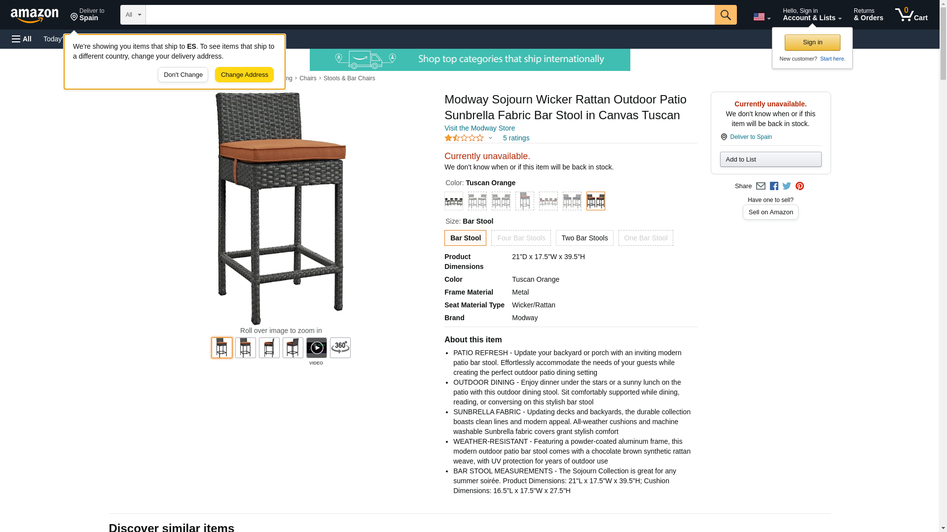 Sojourn Collection EEI-1957-CHC-TUS 21" Outdoor Patio Wicker Sunbrella Bar Stool with All-Weather Fabric Cushion, Synthetic Rattan Weave Material, Aluminum Frame, UV and Water Resistant in Canvas and Tuscan Color