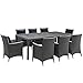 Sojourn Collection EEI-2309-CHC-NAV-SET 9-Piece Outdoor Patio Sunbrella Dining Set with Synthetic Rattan Weave, Powder Coated Aluminum Frame, Water and UV Resistant Including 8 Armchairs and Dining Table in Canvas and Navy