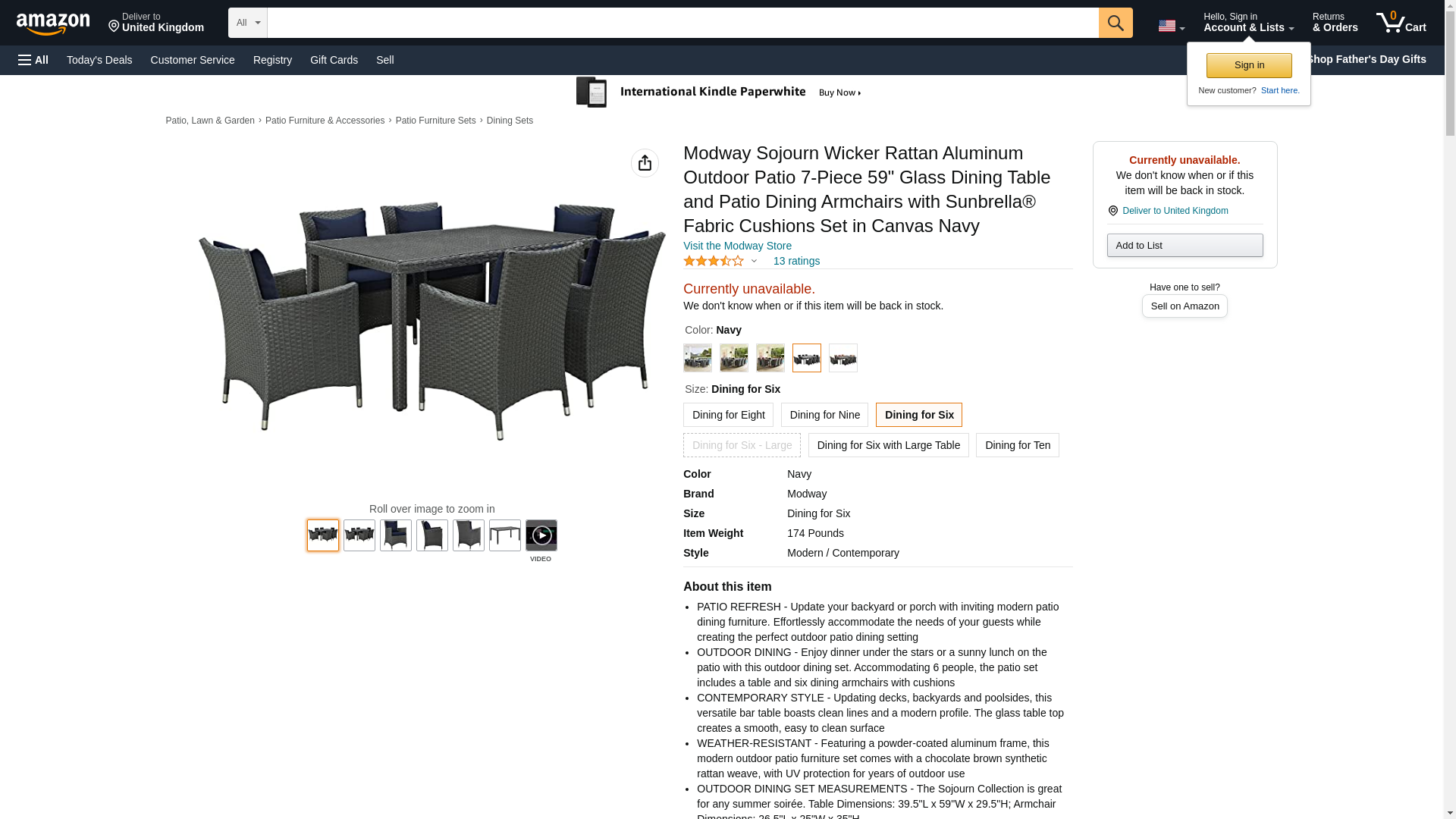 Sojourn Collection EEI-2312-CHC-NAV-SET 7-Piece Outdoor Patio Sunbrella Dining Set with Synthetic Rattan Weave, Powder Coated Aluminum Frame, Water and UV Resistant Including 6 Armchairs and Dining Table in Canvas and Navy Color