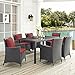 Sojourn Collection EEI-2312-CHC-RED-SET 7 PC Outdoor Patio Sunbrella Dining Set with Synthetic Rattan Weave, Powder Coated Aluminum Frame, Water and UV Resistant Including 6 Armchairs and Dining Table in Canvas and Red Color
