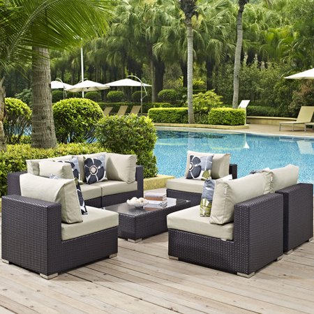 Convene Collection EEI-2357-EXP-BEI-SET 7-Piece Outdoor Patio Sectional Set with 4 Armless Chairs, 2 Corner Sections and Coffee Table in Espresso and Beige Color