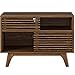 - SPACIOUS STORAGE - The storage space is comprised of four units, and comes with an additional adjustable shelf on the lower right, and sliding slatted doors for concealing media devices not in use