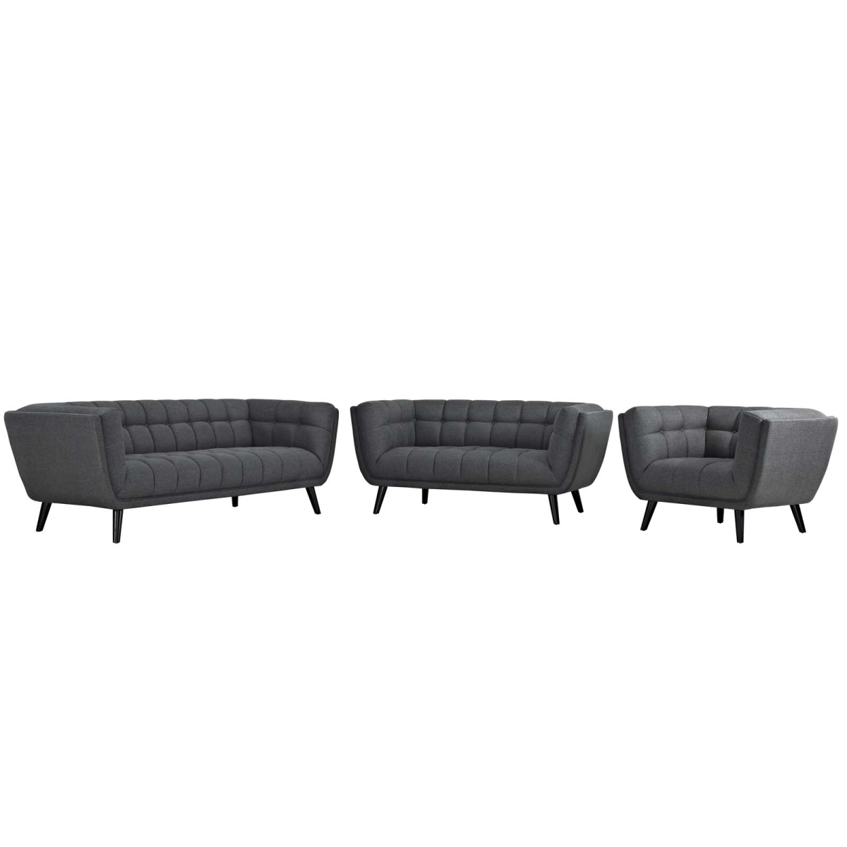 Bestow Collection EEI-2974-GRY-SET 3 PC Sofa, Loveseat and Armchair Set with Dense Foam Padding, Non-Marking Foot Caps, Black Tapered Wood Legs and Polyester Upholstery in Grey Color