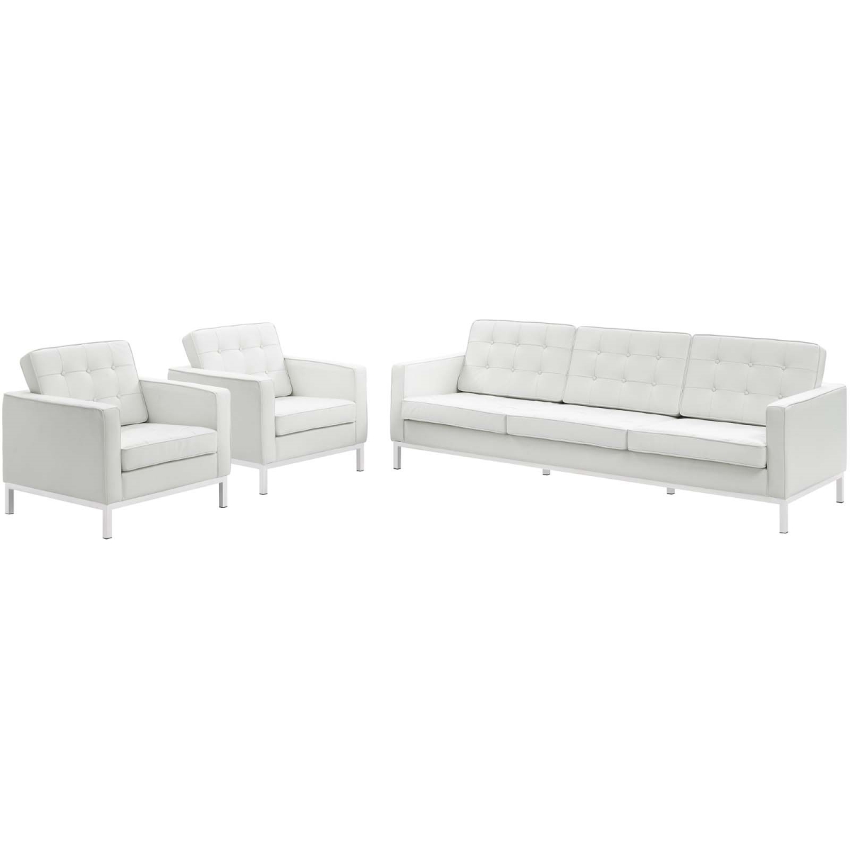 Modway Loft Upholstered Leather Mid-Century Modern Living Room Sofa and Two Armchair Set in White