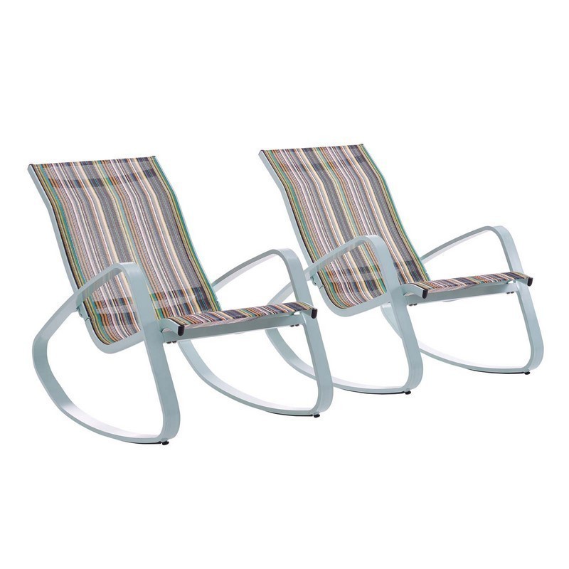 Traveler Collection EEI-3180-GRN-STR-SET Set of 2 Outdoor Rocking Lounge Chair Patio with Powder-Coated Aluminum Frame, Non-Marking Foot Caps and All-Weather Textilene Mesh Sling Seat in Green and Stripe Color