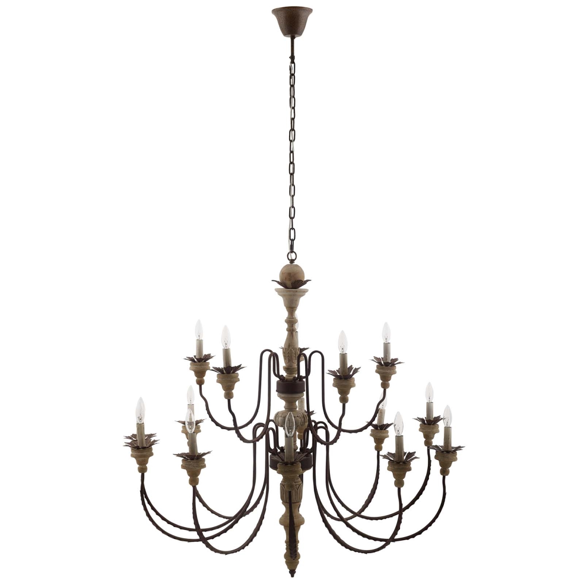 - WOOD AND METAL CEILING LIGHT - With a tiered, beautifully carved wood center column, this candelabra chandelier features rust-colored metal arms and candle-style light holders with metal leaf accents