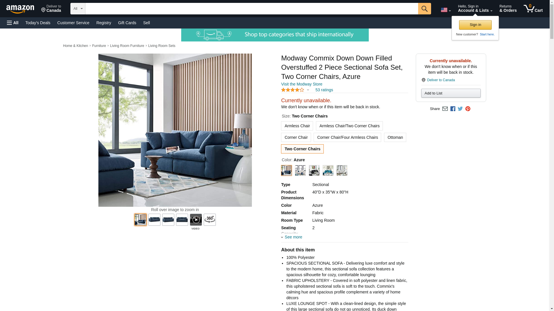 Modway Commix Down Down Filled Overstuffed 2 Piece Sectional Sofa Set, Two Corner Chairs, Azure