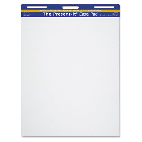 <p></p> <p>The Present-It Easel Pad self-adhesive sheets are perfect for presentations, brainstorming or problem-solving exercises. Sheets are bleed-through resistant, pull off easily to be repositioned, and stick securely to most hard surfaces. Remove or reposition without leaving residue behind. Easel pad includes a convenient carrying handle for easy transportation.</p> <p></p> <b><u>Product Information</u><br /></b> <br /> <b>Skill Learning:</b> Presentation, Exercise <br /> <b>Number of Sheets:</b> 25 <br /> <b>Sheet Type:</b> Plain <br /> <b>Sheet Color:</b> White <br /> <b>Sheet Size:</b> 27" x 34" <br /> <b>Basis Weight:</b> 20 lb <br /> <b>Front Ruling Type:</b> Unruled <br /> <b>Features:</b> Self-stick, Perforated, Repositionable, Bleed Resistant, Removable, Residue-free, Built-in Carry Handle, Recyclable, Hole-punched, Self-adhesive <br /> <br /> <b><u>Miscellaneous</u><br /></b> <br /> <b>Recycled:</b> No <br /> <b>Recycled Content:</b> 0% <br /> <b>Post-consumer-waste%:</b> 0% <br /> <b>Assembly Required:</b> No <br /> <b>Country of Origin:</b> United States