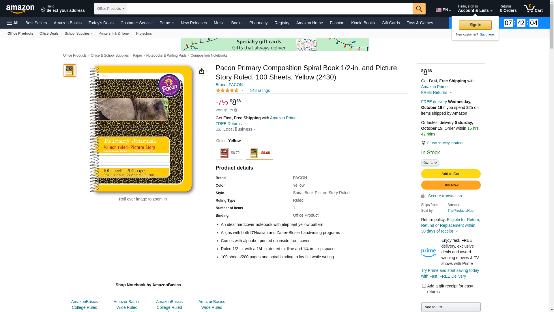 Pacon Primary Composition Spiral Book 1/2-in. and Picture Story Ruled, 100 Sheets, Yellow (2430)
