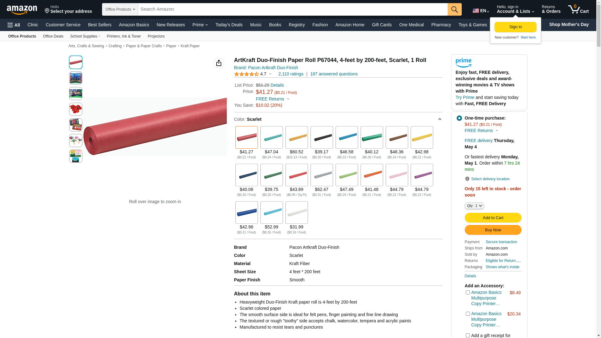Pacon Artkraft Duo-Finish ArtKraft Duo-Finish Paper Roll P67044, 4-feet by 200-feet, Scarlet, 1 Roll