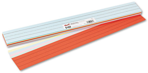 Performs well with inks, pencils and crayons. 1 1/2" guideline ruling with 3/4" dotted midline on one side, and single line ruling on the other side. Recyclable. Performs well with inks, pencils and crayons. 1 1/2" guideline ruling with 3/4" dotted midline on one side, and single line ruling on the other side. Recyclable. 24" x 3". Color(s): Assorted; Global Product Type: Sentence Strips; Assortment: Blue; Canary; Green; Orange; Pink; Material(s): Tagboard.