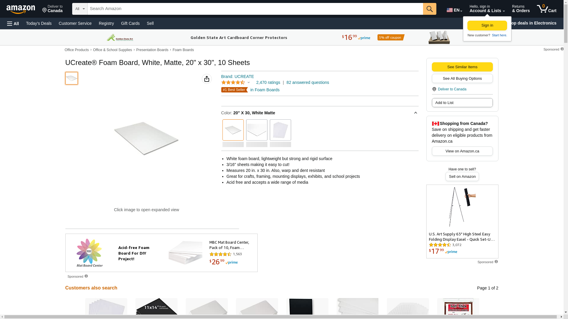 UCreate Foam Board, White, Matte, 20" x 30", 10 Sheets