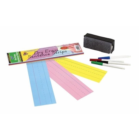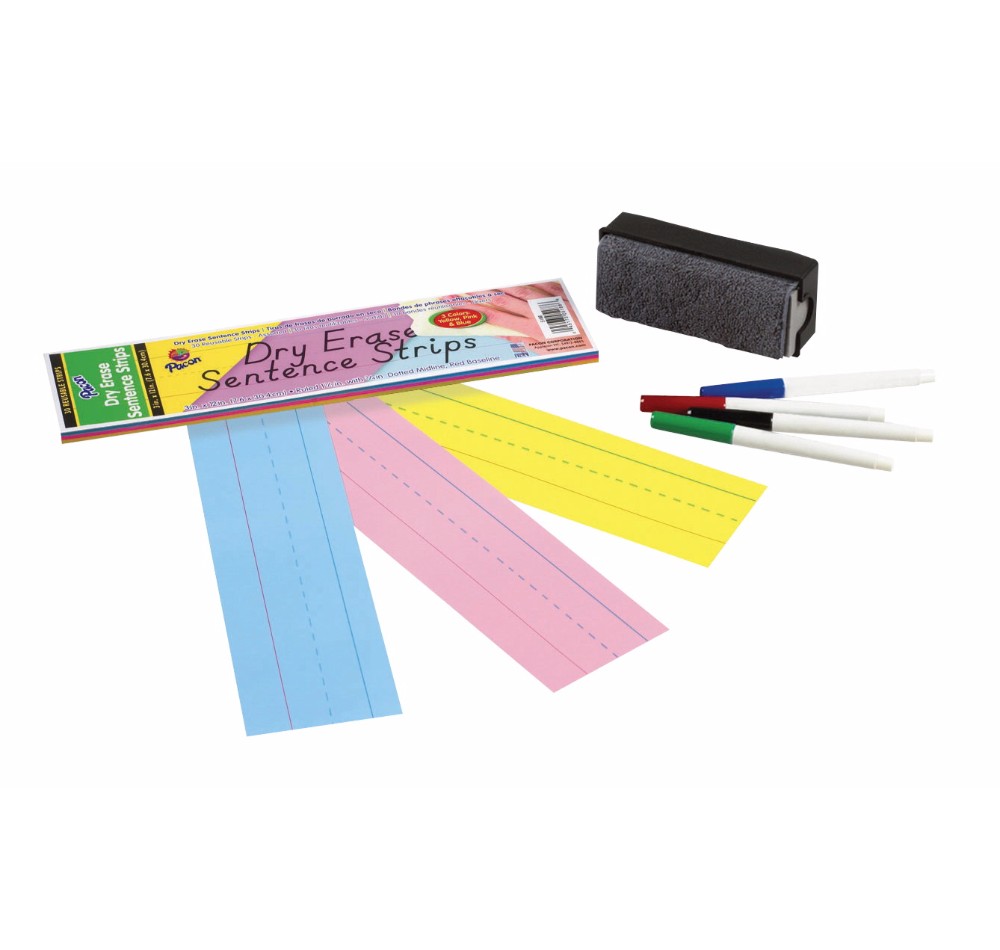 Pacon Dry Erase Sentence Strip in assorted colors include blue pink and yellow. Strip measuring 3 x 12 in. contains 1-12 in. rule with red baseline and 34 in. dotted midline on dry erase side. Strip with dry erase surface is convenient as well as reusable so that teachers can use them again and again 30 per pack.