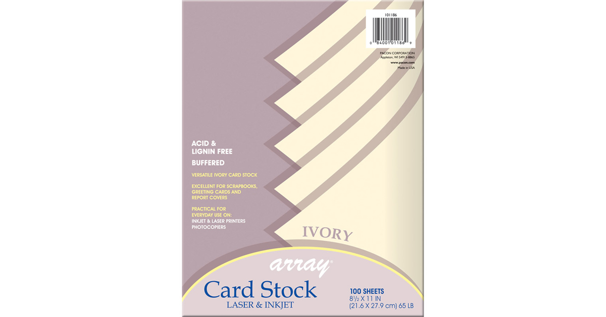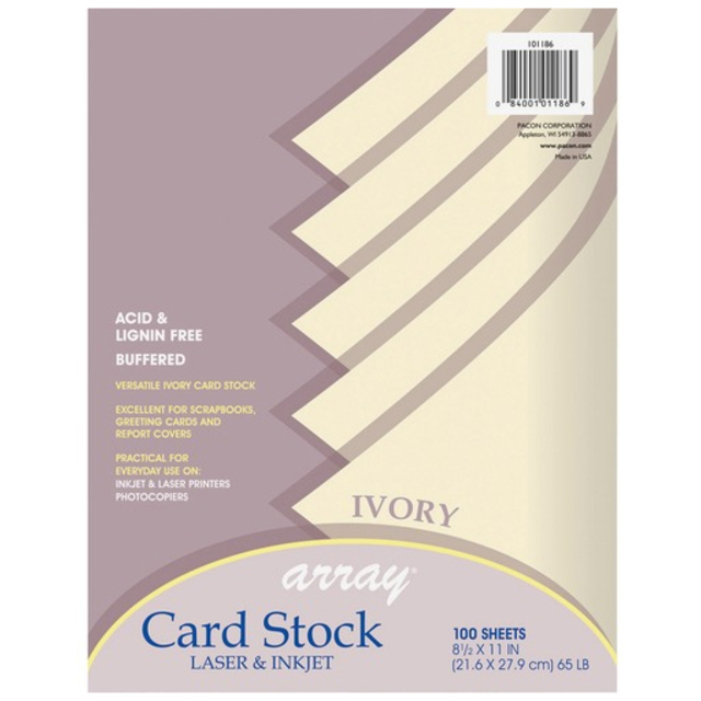 Array Card StockFor report covers, flyers, postcards and art projects. Use in printers, copiers or typewriters. Acid-free for archival quality. Paper Color(s): Ivory; Sheet Size: 8 1/2 x 11; Paper Weight: 65 lb. Global Product Type: Paper-Card Stock Size: 8 1/2 x 11 Paper Color(s): Ivory Paper Weight: 65 lb Sheets Per Unit: 100 Machine Compatibility: Copiers;Inkjet Printers;Laser Printers;Typewriters Pre-Consumer Recycled Content Percent: 0% Post-Consumer Recycled Content Percent: 0% Total Recycled Content Percent: 0%
