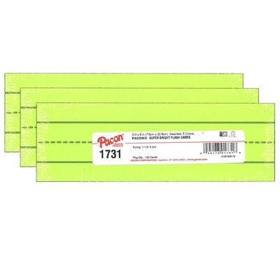 Pacon Super Bright Flash Cards, 5 Assorted Colors, 1.5" x 0.75" Ruled 3" x 9", 100 Cards Per Pack, 3 Packs