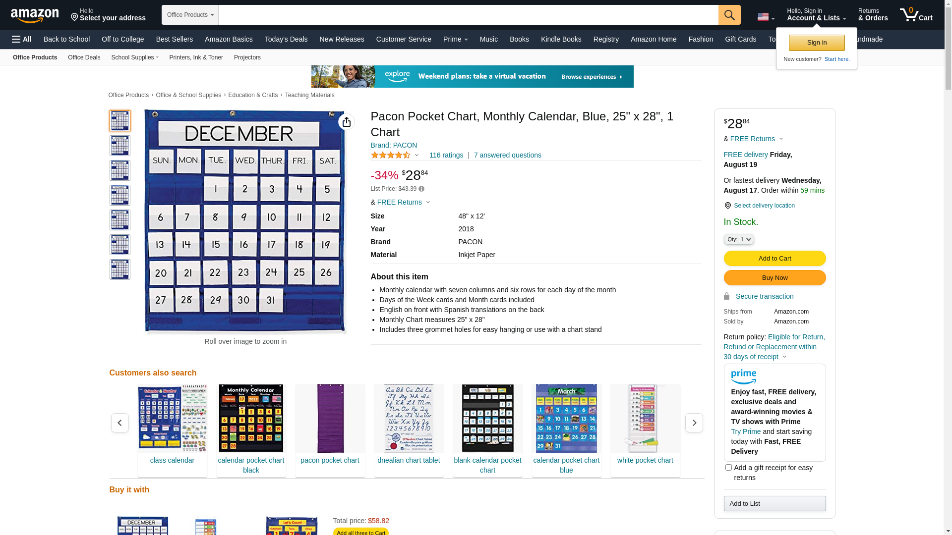 | Feature | Sold as 1 EA. Monthly chart offers a versatile, easy-to-read, unique monthly calendar for the classroom year-round. Seven columns and six rows provide a pocket for each day of the month. Chart includes English and Spanish month and day cards. Use included Hook-and-loop closures for attaching a weekly calendar (sold separately). Attach month chart easily to the Pacon Weekly Calendar Pocket Chart. |